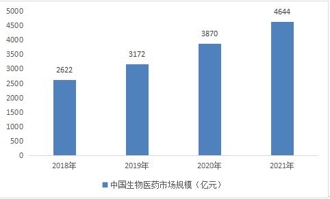在技术进步、产业结构调整和消费支付能力增加的驱动下,中国生物医药市场规模也呈稳定上升态势。2018年到2021年,我国生物医药市场总体规模从2622亿元增加到4644亿元,年均复合增长率达20%。