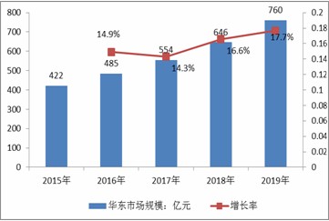图表:2015-2019年华东地区市场规模(亿元)及增长速度