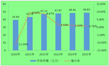 图表:2020-2025年镍氢蓄电池行业市场规模及增速预测