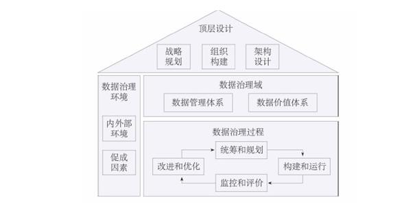 数据治理框架包含顶层设计、数据治理环境、数据治理域、数据治理过程四大部分。
