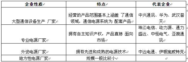通信能源系统的原生产厂商指系统 中重要器件——整流模块和监控单元自主生产的企业。集团公司根据标书的评定结果,结合各省公司的推荐意见,具体分配各中标企业在相应区域的份额。通信能源行业具体 的销售由中标企业自身或其经销商完成。由于各入围厂商在产品价格、技术、质 量等方面差异较小,因此综合实力因素成为各厂商竞争的焦点,尤其是售后服务的专业及时性成为中标的关键因素。