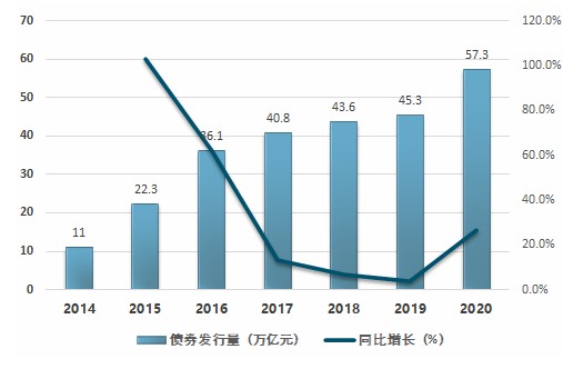 图表:2014-2020年债券市场发行量趋势图(单位:万亿元)