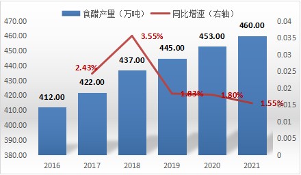 自2010年来我国食醋行业总体产量稳步上升,但增速较缓,到2018年中国食醋产量达到437万吨,同比增长3.55%;2019年中国食醋产量为445万吨,同比增长1.83%。2021年食醋产量达460万吨,同比增速为1.55%。