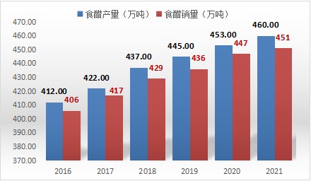 2016-2021年中国食醋市场产销呈现逐年增长的趋势,由于食醋行业发展比较成熟,行业竞争者众多,消费量增长较慢,导致行业出现供大于求的显现,2021年食醋行业的产销量分别为460/451万吨。
