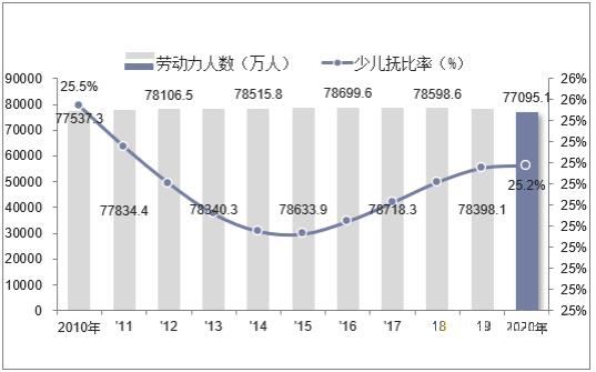 图表:2010-2020年中国劳动力人数及少儿抚比率统计