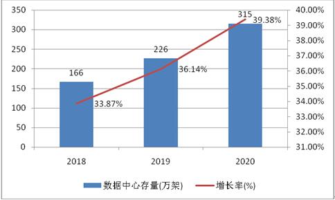 在政策利好驱动下,我国数据中心基础设施建设稳步推进。数据显示,2018-2020年,我国在用数据中心机架数分别为166架、226架以及315万架,建设速度分别达到了33.87%、36.14%和39.38%。