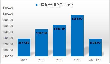 我国十种有色金属产量一直呈增长趋势,增速有所放缓。2019年我国十种有色金属为5841.59万吨,同比增长2.70%。规上有色金属工业增加值增长8.2%,高于工业平均2.5个百分点。2021年1-10月产量为5376.0万吨。