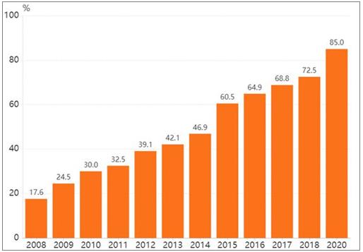 图表:2008-2020年中国移动支付普及率(单位:%)