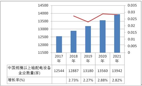 近年来,由于经济下行压力,国家对新基建建设力度加大,国家电网加快以特高压为代表的电网投资步伐,近几年输配电设备行业的入局者有望持续增加,参考历年数据、国内行业企业发展情况,2020-2021年全国规模以上输配电设备行业企业数量大约为13560家、13942家。