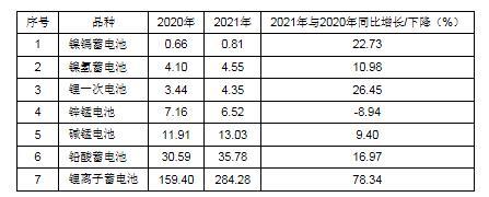 2021年中国主要电池品种出口额为349.31亿美元,2020年出口额为217.26亿美元,同比上涨60.78%。其中,锂离子蓄电池出口额占81.38%,铅酸蓄电池出口额占10.24%,锌锰/碱锰电池出口额占5.60%,镍氢蓄电池出口额占1.30%,镍镉蓄电池出口额占0.23%。