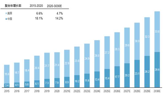 图表:2015-2030E中国和美国正畸市场规模预测(单位:十亿美元)