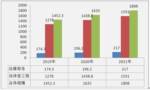 中研普华产业研究院相关数据统计显示,2019-2021年期间,我国洁净室服务行业市场规模逐年递增,2019年,我国洁净室服务行业总体市场规模达到1452.3亿元,其中洁净室工程市场规模在1278亿元左右,洁净室运营维护服务在174.3亿元左右。2021年,我国洁净室服务行业总体市场规模达到1808亿元,其中洁净室工程市场规模在1591亿元左右,洁净室运营维护服务在217亿元左右。