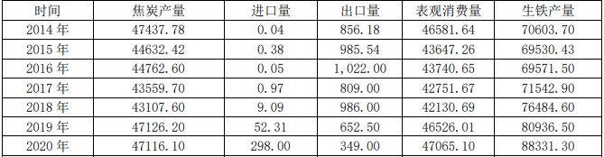 图表:2014-2020年我国焦炭供需平衡表