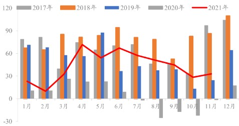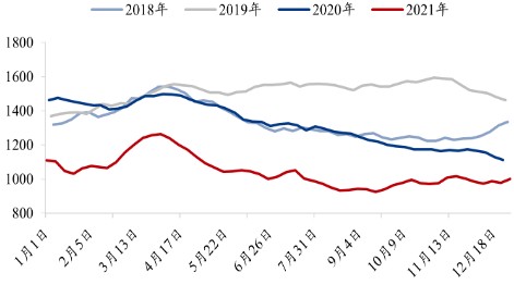 图表:2018-2021年全国焦炭日产量情况(单位:万吨)