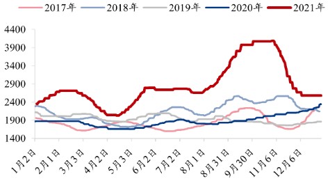 图表:2017-2021年我国焦炭价格走势情况(单位:元/吨)
