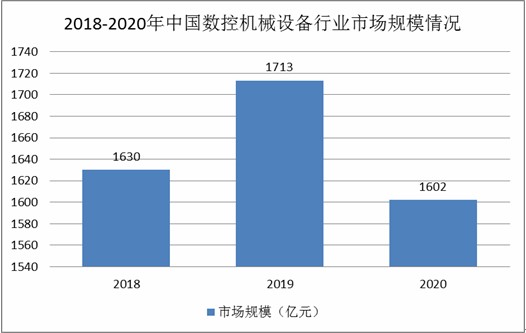 受国内新冠疫情的影响,数控机械设备行业的复工复产情况较慢,产品的供给和需求都有一定幅度的下滑,整个行业受到了较大程度的影响。2020年,国内数控机械设备行业的市场规模约为1602亿元,较2019年下降了6.48%。