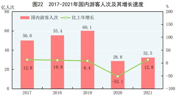 全年国内游客32.5亿人次,比上年增长12.8%。其中,城镇居民游客23.4亿人次,增长13.4%;农村居民游客9.0亿人次,增长11.1%。国内旅游收入29191亿元,增长31.0%。其中,城镇居民游客花费23644亿元,增长31.6%;农村居民游客花费5547亿元,增长28.4%。