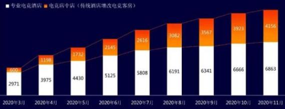 从数据来看,2020年3-11月,全国电竞酒店数量直线破万,总额呈明显的上升之势,平均月增速约为130%,行业规模持续扩大。值得关注的是,随着电子竞技热度持续上升、疫情影响下消费升级的市场需求、多电竞扶持政策的相应出台,国内电竞酒店的数量爆发增加,逐步成为传统酒店及网吧转型升级的主要方向。