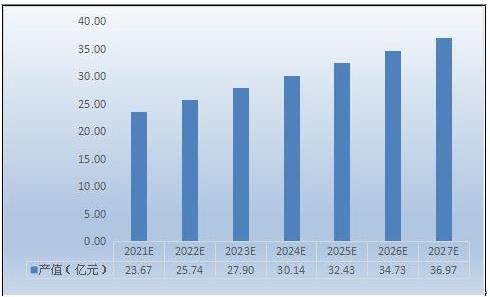 图表:2021-2027年国内聚芳硫醚砜总产值预测