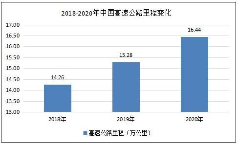 2018年底,全国高速公路里程达14.26万公里,比2017年末增加0.82万公里。近年来,我国高速公路里程保持持续增长的状态,并且在“十三五”期间依然有望延续这一增长势头。2020年全国高速公路里程数达到16.43万公里。