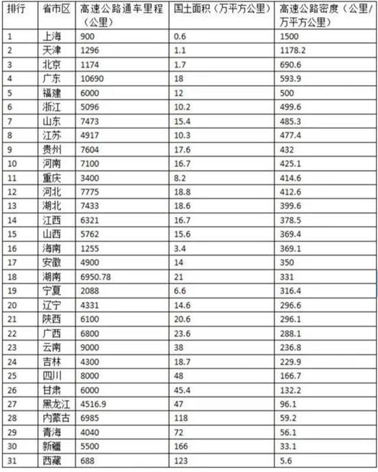 再从高速公路密度来看,排名前十的省份:上海、天津、北京、广东、福建、浙江、山东、江苏、贵州、河南。总体来说,还是与经济发达程度关系较大。