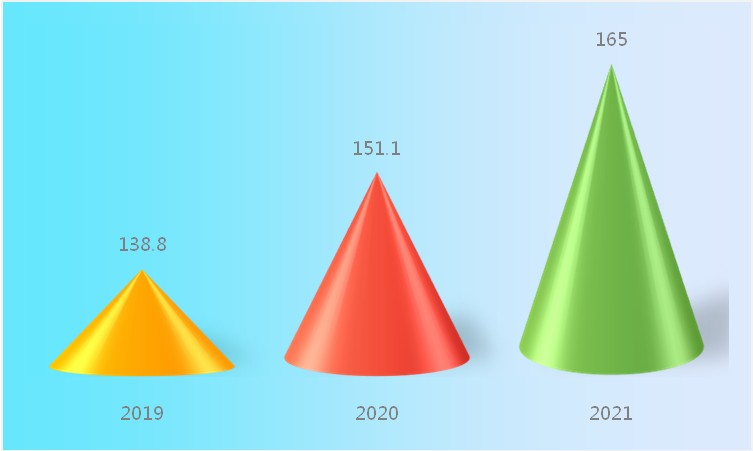 数据显示, 2019年中国高尔夫球场资产规模从2018年的131.5亿元增长到138.8亿元,2020年中国高尔夫球场资产规模为151.1亿元,2021年资产规模约为165亿元,2018-2021年的复合增长率为7.86%。