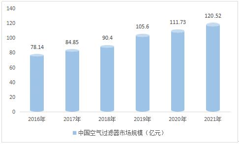 空气过滤器市场空间与国内空气质量情况息息相关,在国内持续加强空气质量优化的相关政策支持下,空气过滤器行业市场规模迅速增加。2019年我国空气过滤器行业市场规模达到105.6亿元,随着经济结构的不断转型和对空气质量要求的不断提升,对空气过滤器的需求会不断增加,2021年因为疫情居民对于空气洁净更加注重,我国空气过滤器行业市场规模达到120.52亿元。