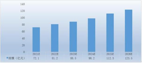 2020年胶原蛋白行业市场规模约为64.7亿元。预计到2022-2027年,中国胶原蛋白市场规模将由72.1亿元上升到123.5亿元。