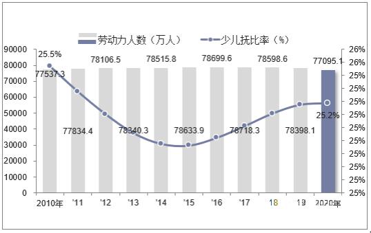 图表:2010-2020年中国劳动力人数及少儿抚比率统计