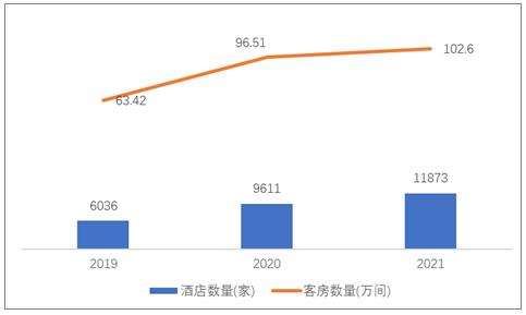 中国饭店协会的数据显示,2019年1月1日中国中端连锁酒店的门店数量达到6036家,客房数量达到63.42万间;2020年1月1日,中国中端连锁酒店的门店数量达到9611家,客房数量达到96.51万间,客房同比增幅超过50%;到了2021年1月1日,我国中端连锁酒店营业数增加到11873家,客房数约为102.6万间,客房同比增长6.31%。