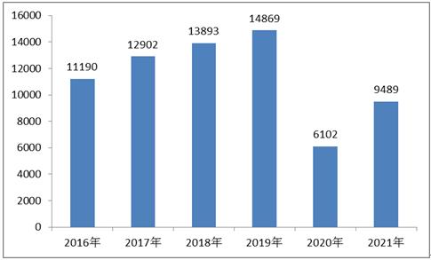 图表:2016-2021年全球酒店和度假村市场规模(单位:亿美元)
