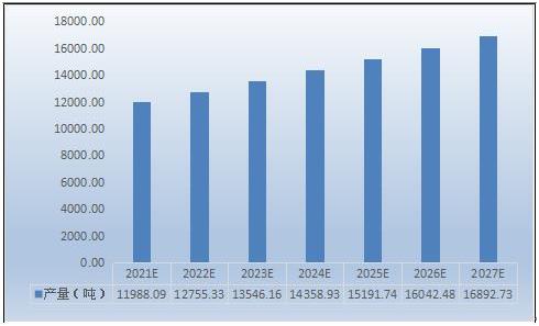 2016年7月28日,在四川建成中国首条聚芳硫醚砜(PASS)生产线,填补了国内空白。新疆生产线的产能是四川的3倍,原料均取自新疆,不仅在产能上弥补四川产能上的不足,同时可以为拓展中东、非洲等国际市场留下足够的空间。据数据显示,聚芳硫醚砜产量逐年上涨,2021年国内聚芳硫醚砜产量大11988吨,预测到2027年将达到16892吨。