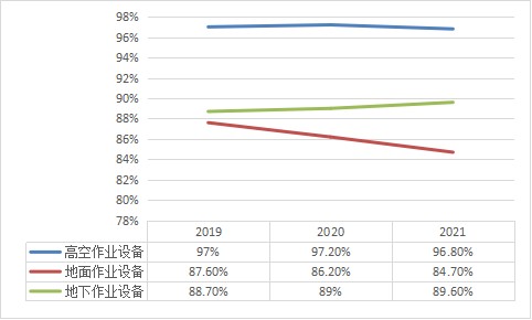 数据显示,我国机械租赁行业不同细分类型设备产销率情况如上图所示。