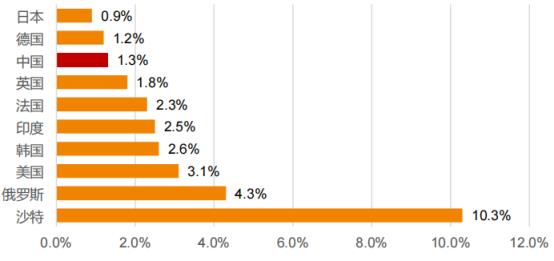 我国经济总量持续增长,国防费用投入稳步增加。2016-2019年,我国军费占GDP比重分别为1.31%、1.25%、1.20%、1.20%,基本保持稳定。2020年,国防军费增速6.7%,规模达到约1.27万亿,连续四年突破万亿。但相比发达国家2%~4%的军费GDP占比,中国军费负担相对较轻,因此为后续军费的增加留下了增长空间。