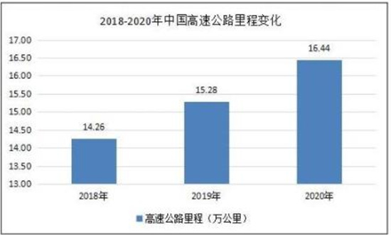 2018年底,全国高速公路里程达14.26万公里,比2017年末增加0.82万公里。近年来,我国高速公路里程保持持续增长的状态,并且在“十三五”期间依然有望延续这一增长势头。2020年全国高速公路里程数达到16.43万公里。
