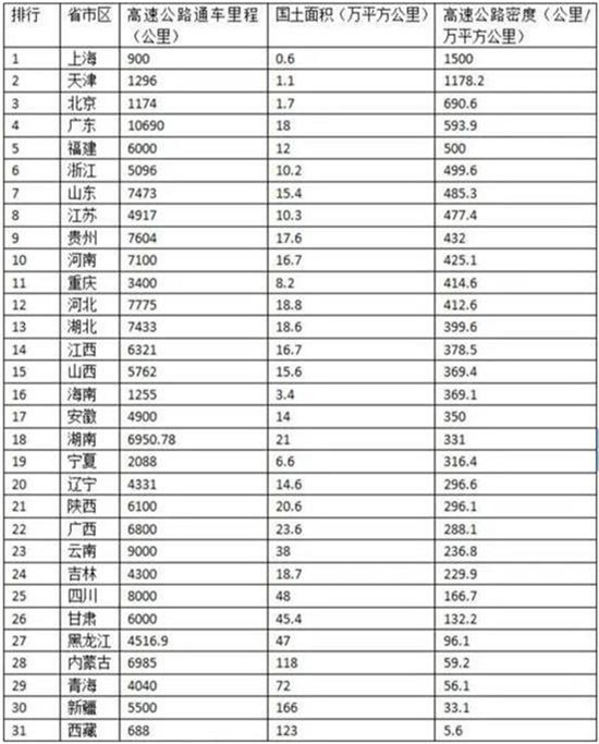 再从高速公路密度来看,排名前十的省份:上海、天津、北京、广东、福建、浙江、山东、江苏、贵州、河南。总体来说,还是与经济发达程度关系较大。