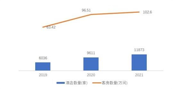 中国饭店协会的数据显示,2020年1月1日,中国中端连锁酒店的门店数量达到9611家,客房数量达到96.51万间,客房同比增幅超过50%;到了2021年1月1日,我国中端连锁酒店营业数增加到11873家,客房数约为102.6万间,客房同比增长6.31%。