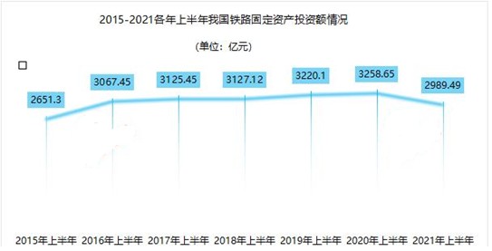 2021年上半年,全国铁路固定资产投资累计完成2989.49亿元,同比下降8.26%,近6年来第一次不到3000亿元。