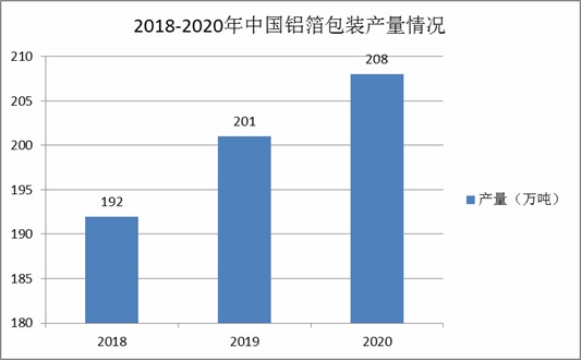 近年来,人们对产品包装的要求越来越高,包装工业迅速崛起,各种新型包装材料层出不穷。其中,铝箔材料渐渐显示出自身的优势,成为各大包装制造厂的材料。2020年,中国铝箔包装材料的产量约为208万吨,较2019年上涨了3.48%。