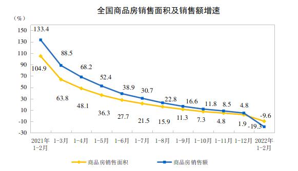 1—2月份,商品房销售面积15703万平方米,同比下降9.6%,其中,住宅销售面积下降13.8%;商品房销售额15459亿元,下降19.3%,其中,住宅销售额下降22.1%。