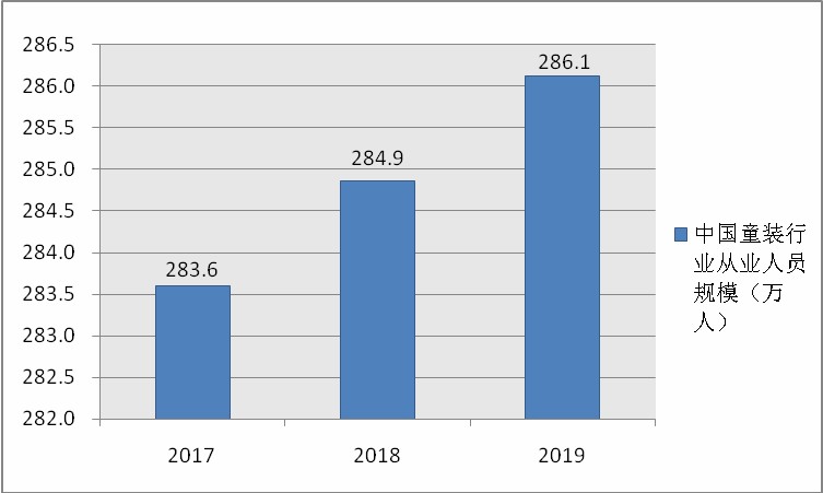 2017-2019年中国童装行业从业人员规模呈逐年增长趋势,2017年从业人员数量为283.6万人,到2019年底中国童装行业从业人员数量规模已经达到约286.1万人的水平。