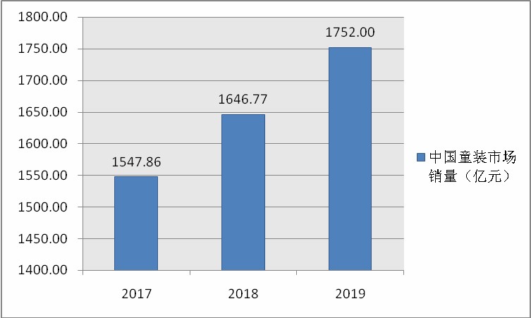 图表:2017-2019年我国童装市场销量规模(单位:亿元)
