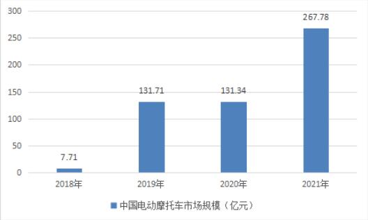 2018年中国电动摩托车市场规模为7.71亿元,2019年电动摩托车销量大增,市场规模达到131.71亿元,随着政策对电动摩托车的支持,2021年市场规模增长至267.78亿元。