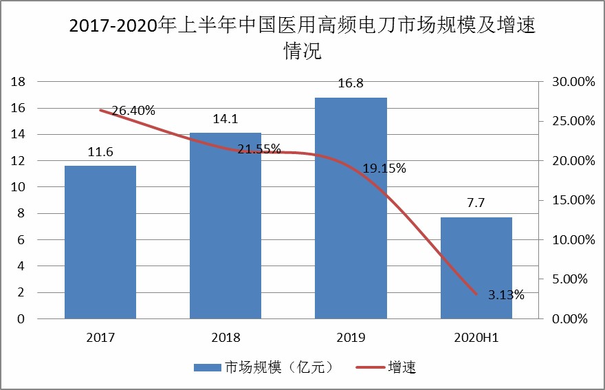 图表:2017-2020年上半年中国医用高频电刀市场规模及增速情况
