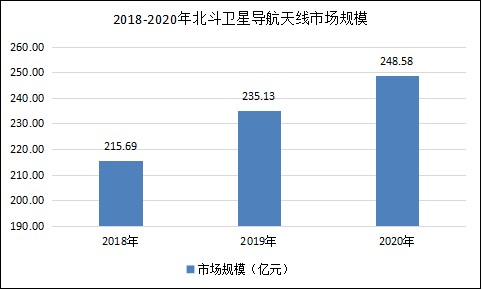 据数据显示,2018年北斗卫星导航天线市场规模为215.69亿元,2019年北斗卫星导航天线市场规模为235.13亿元,2020年北斗卫星导航天线市场规模为248.58亿元,同比增速为5.72%。