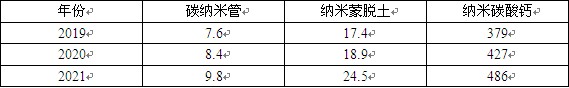 图表:2019-2021年国内部分纳米材料产量(万吨)