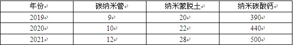 图表:2019-2021年国内部分纳米材料产能(万吨)
