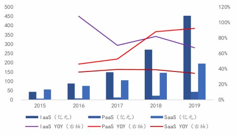 从全球细分市场来看,全球SaaS市场规模最大,IaaS次之,PaaS最小。2019年,全球SaaS云计算市场规模已达1095亿美元,同比增长了18.00%,占比58.15%;IaaS市场规模为439亿美元,同比增长了26.15%,占比23.31%;PaaS市场规模为349亿美元,同比增长了23.76%,占比18.53%。预计全球云计算2020-2023年仍处在快速增长阶段,到2023年,SaaS、IaaS、PaaS市场规模将分别达到1877亿美元、971亿美元、749亿美元量级。与全球市场规律不同的是,我国当下IaaS市场规模最大,SaaS次之,PaaS最小。2019年,中国IaaS市场规模为452.6亿元,同比增长了67.38%,2015—2019年复合增长率为181.18%;SaaS市场规模为194.8亿元,同比增长了34.16%,复合增长率为137.00%;PaaS市场规模为41.9亿元,同比增长了92.20%,复合增长率为168.48%。在企业对云服务认可度不断上升的背景下,企业通过SaaS实现管理和业务全面云化的需求不断增加。再加上2020年初新冠疫情全球范围内的扩散传播,国内远程办公、在线教育需求不断增长,SaaS市场规模将迎来爆发式增长,云需求从IaaS向SaaS上移将是未来大势所趋。