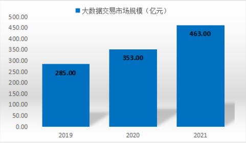 随着数据交易类型的日益丰富、交易环境的不断优化、交易规模的持续扩大,我国数据变现能力显著提高。2019-2021年我国数据交易市场规模呈现快速增长趋势,2021年数据交易市场规模达463.0亿元。