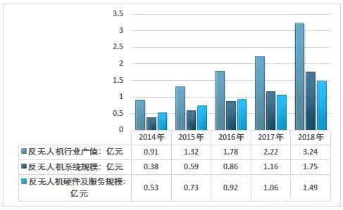 数据显示,我国反无人机市场规模为1.75亿元,反无人机硬件市场规模达到1.49亿元。反无人机行业投资前景正逐年逼近无人机市场份额。